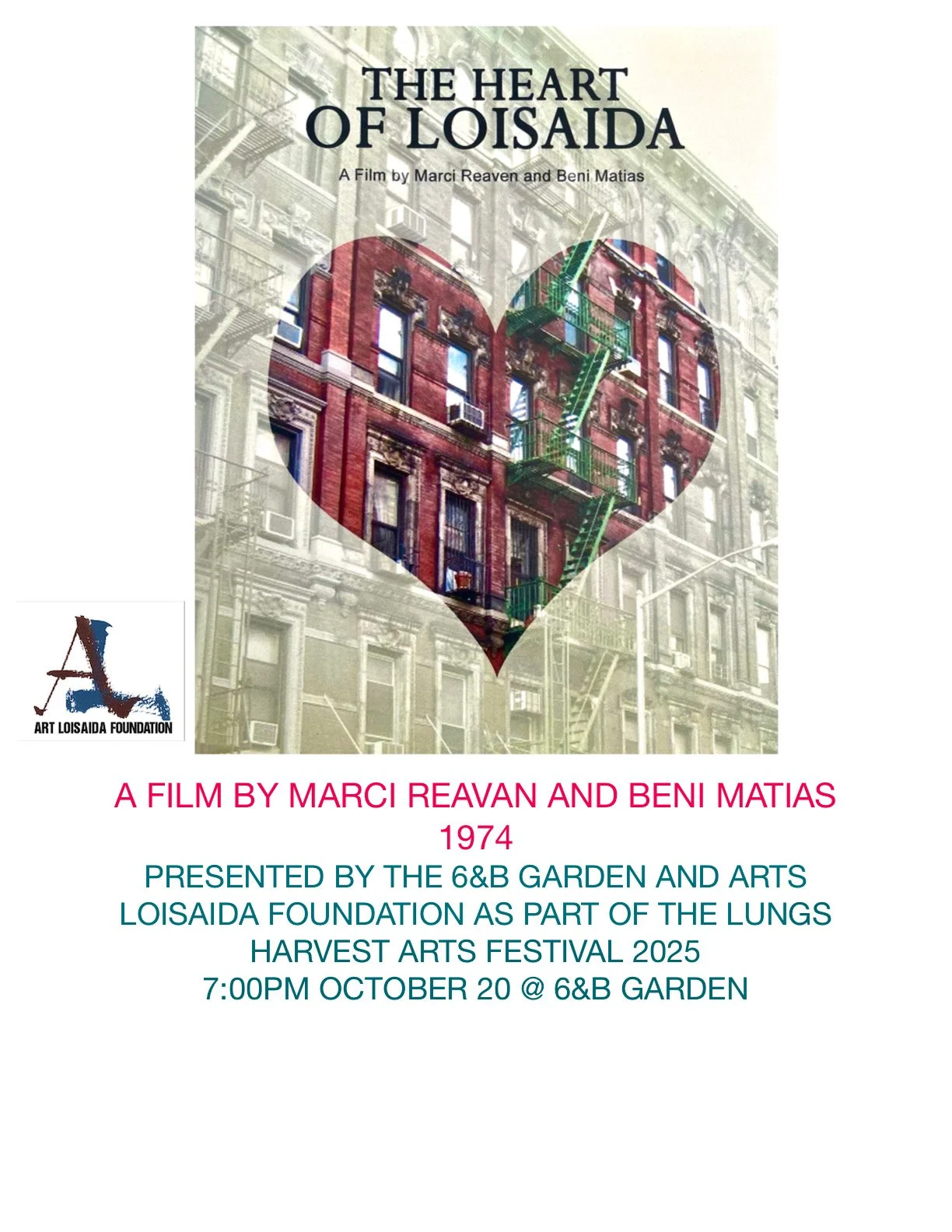 Film Screening - "El Corazón de Loisaida" (The Heart of Loisaida) Monday, October 20, 2025 7:00 PM 9:00 PM Google Calendar ICS A film about efforts on New York’s Lower East Side to revive abandoned buildings through the work and persistence of the local, predominantly Latino residents. Directed by Beni Matías and Marci Reaven. More info here.
